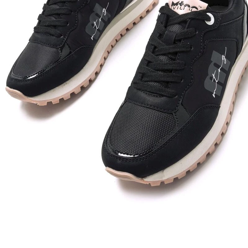 Compra en Decathlon Zapatillas de caminar para mujer mtng joggo-t en color negro Zapatilla deportiva Joggo Track mtng para mujer. De color negro, con detalles en rosa. Puntera almendrada y cierre con cordones negros planos. Nombre y logo de la marca en el lateral.